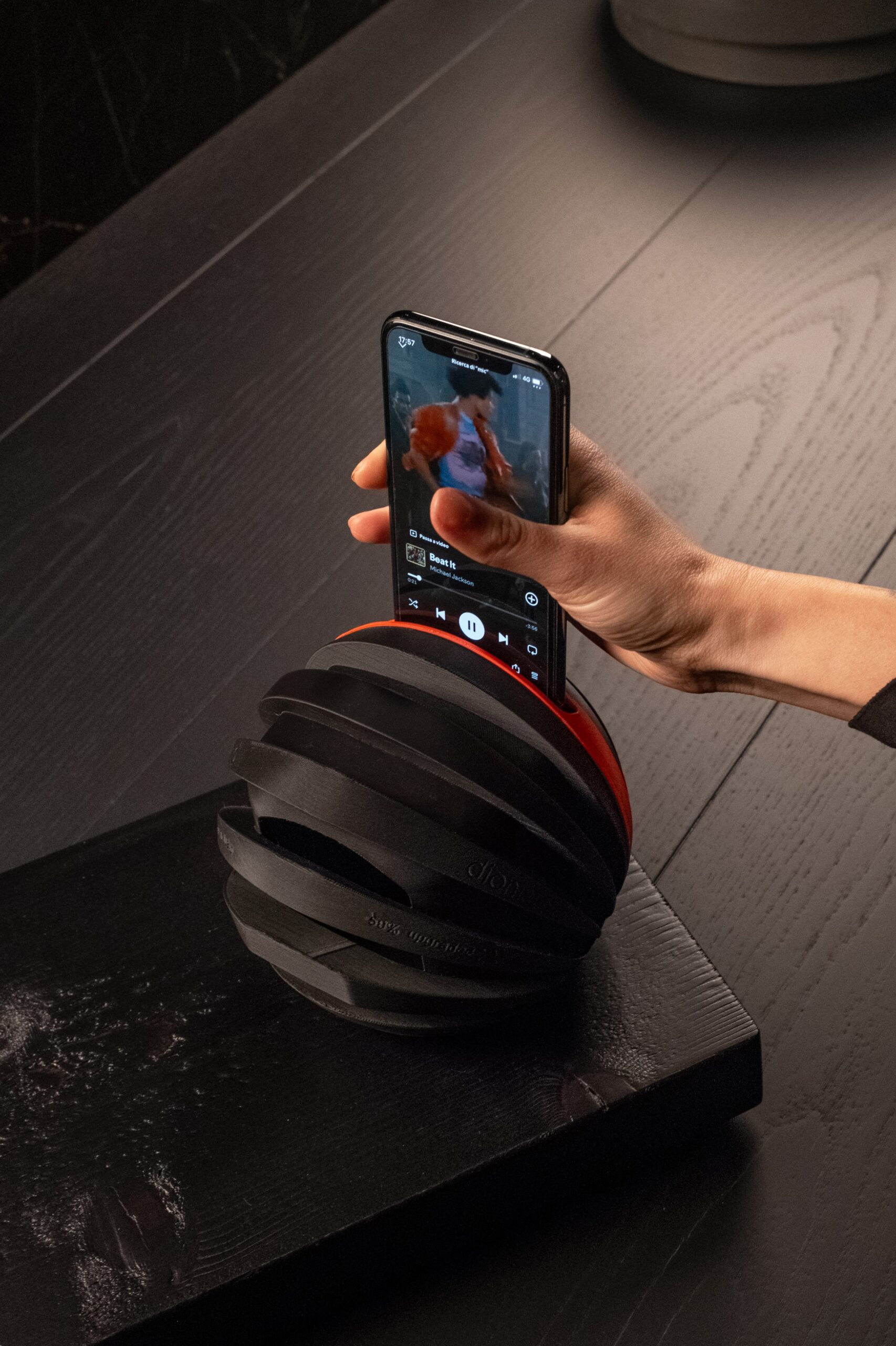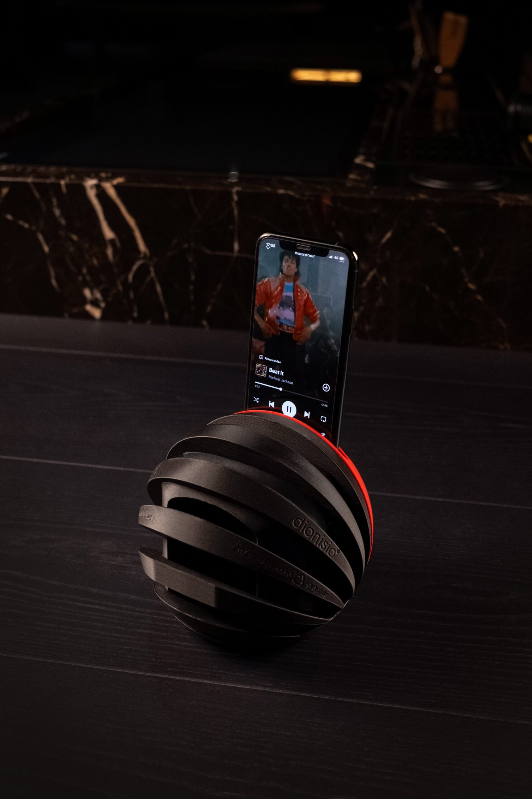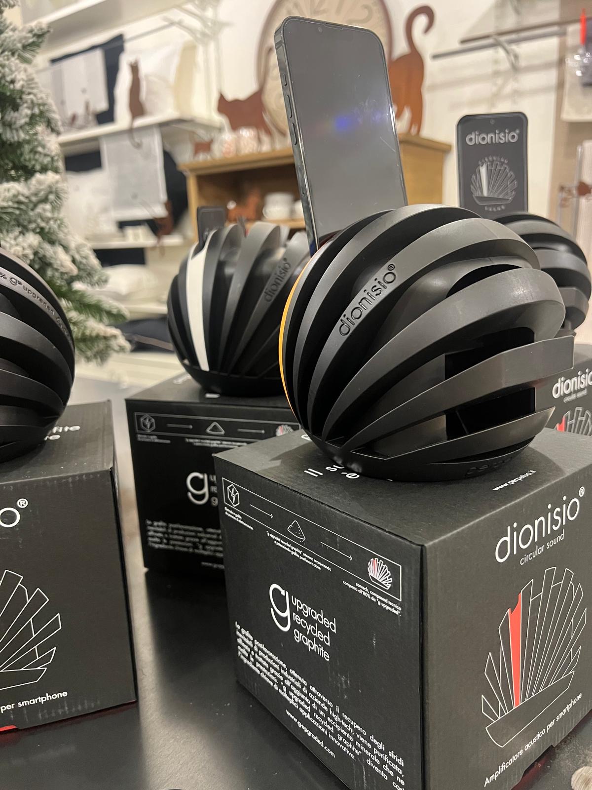 Realizzato in materiale composito a base di grafite riciclata e legno, DIONISIO sfrutta la geometria per restituire un suono pieno, diffuso a 360°. Nessun cavo, nessuna batteria: solo la magia del suono puro, amplificato naturalmente. È compatibile con la maggior parte degli smartphone e ideale per ogni ambiente: dalla cucina allo studio, dal soggiorno al giardino.