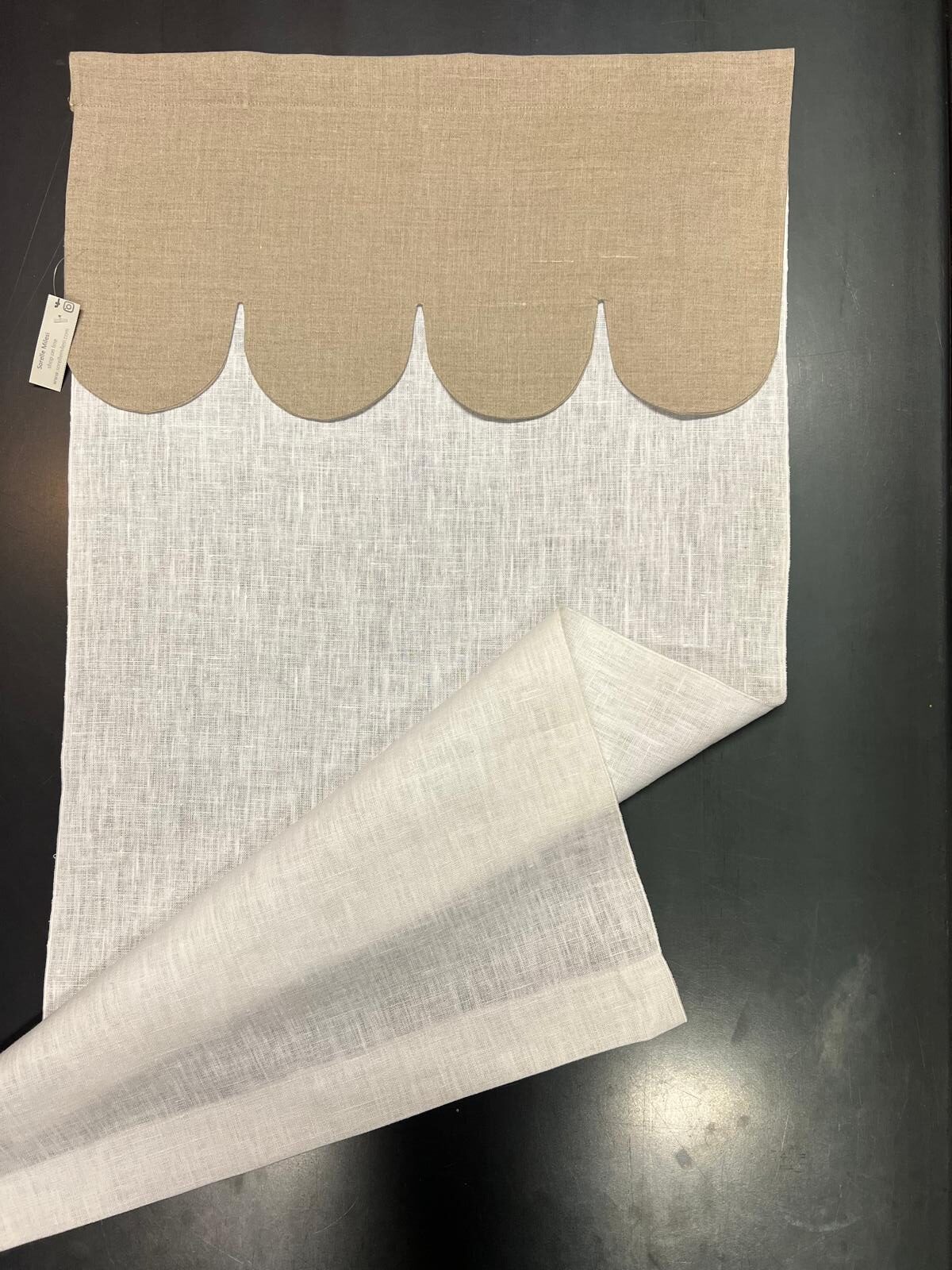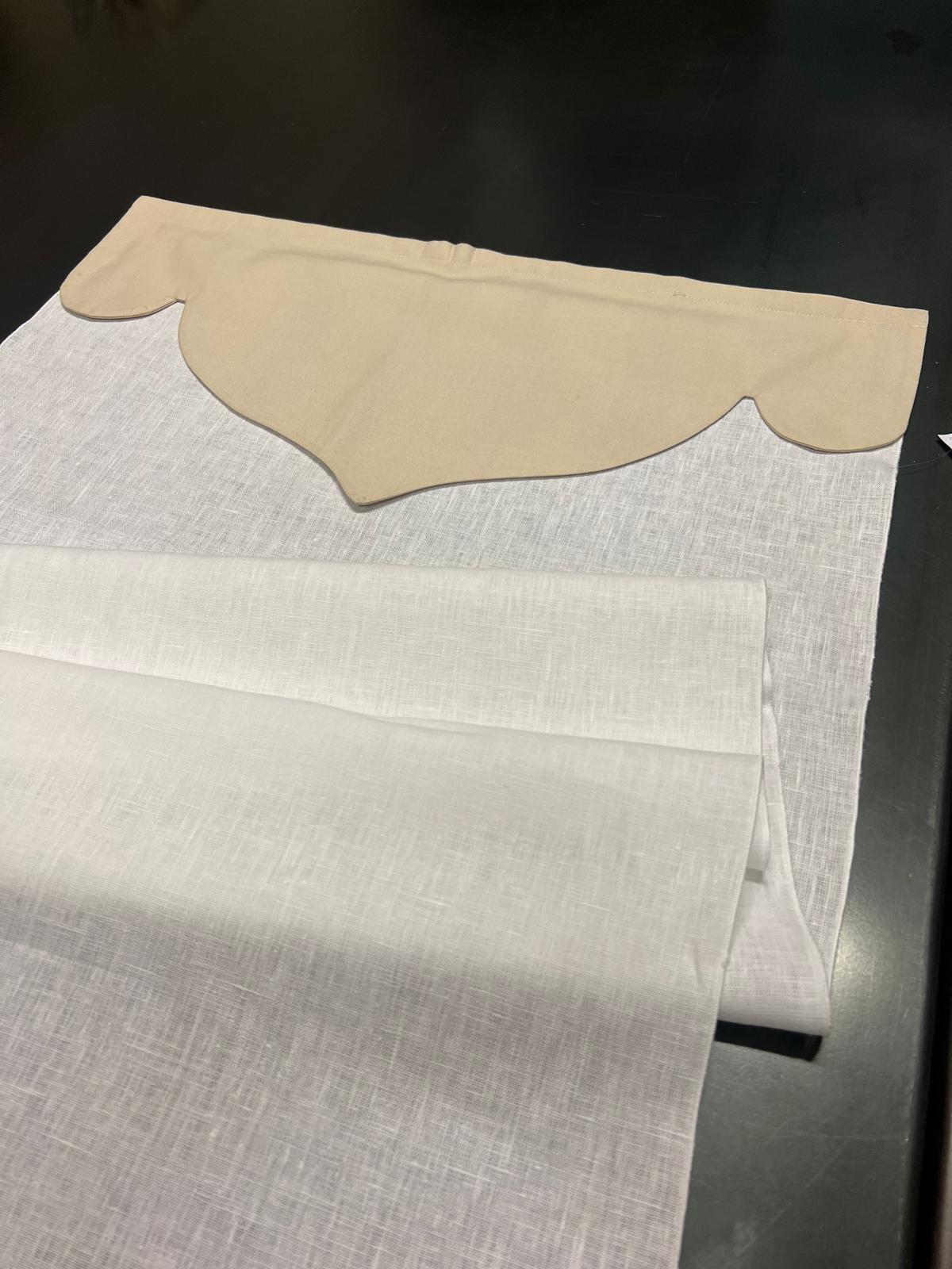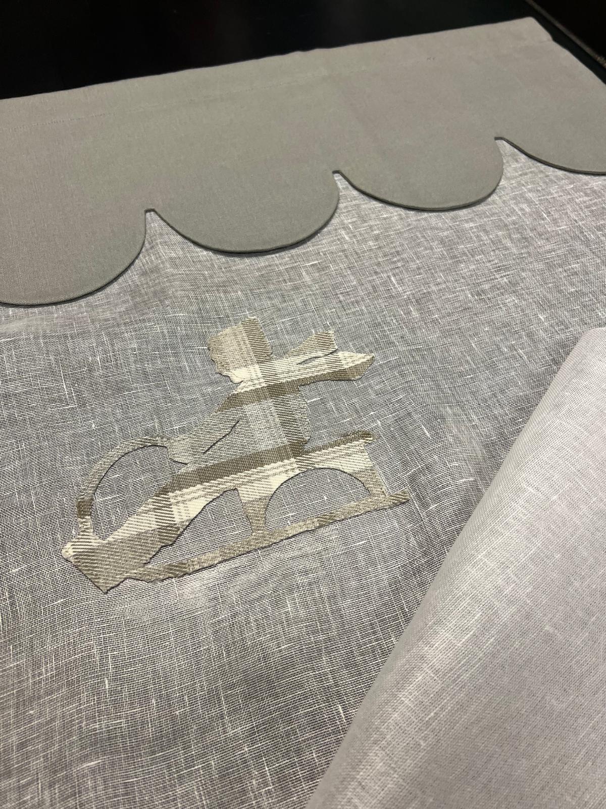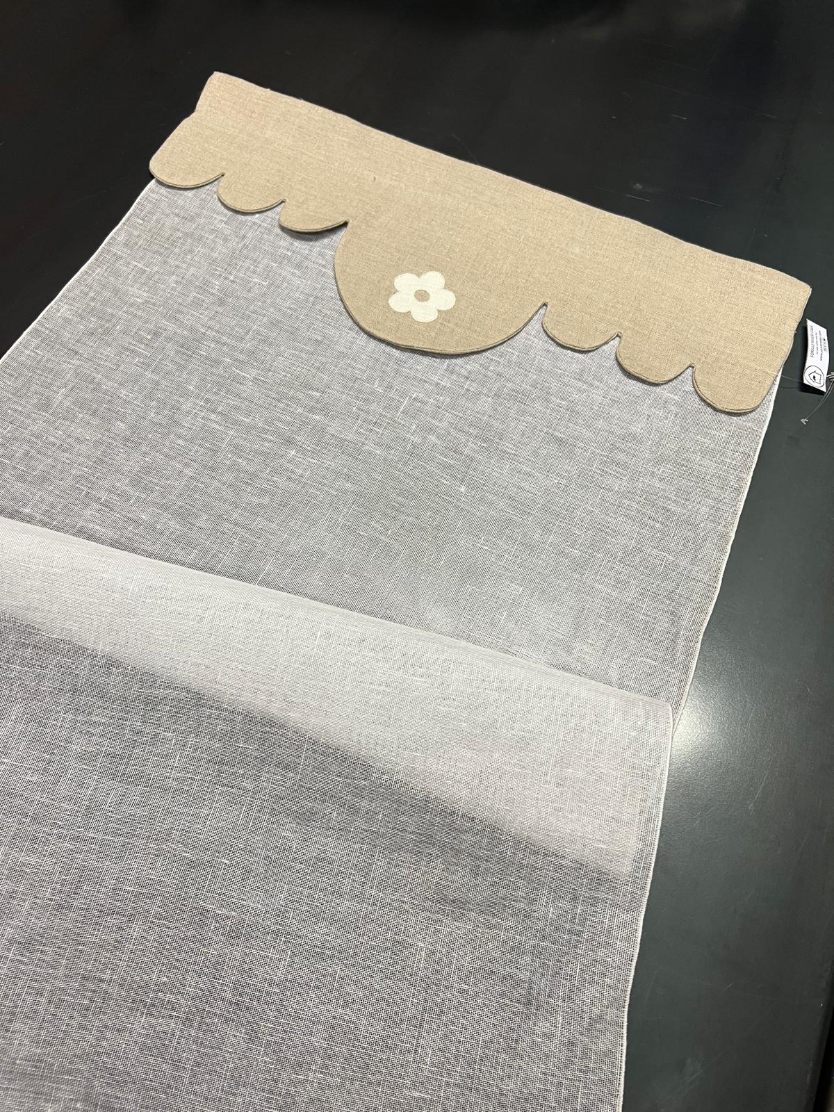 | Dettagli | Telo lino leggero bianco con mantovana grigia |
